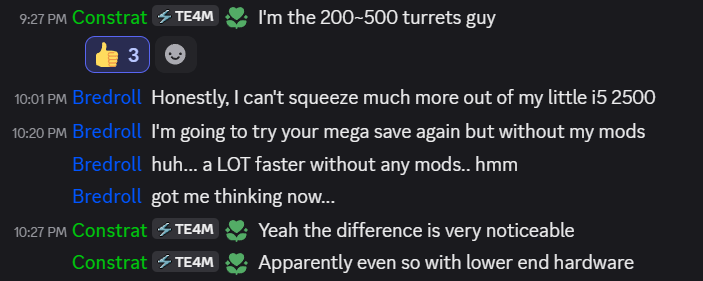 Now that I’ve I think squeezed a good deal of performance out of my lua code it’s worth looking at how the game feels when really under stress all in the same scenario but without mods, and with 3 different versions of Revolution:
