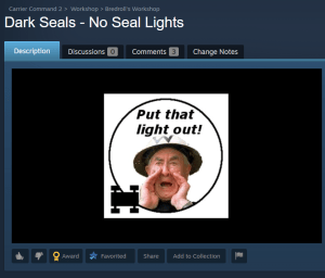 The very first mod I made for CC2 was the Dark Seals mod to remove the headlights from seals. I figured at the time there would be a little Mr Hodges running around the islands shouting “put that light out”. Headlights are basically “shoot me” beacons.